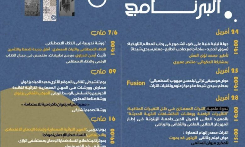 تحت إشراف وزيرة الشؤون الثقافية أمينة الصرارفي، ينظم المعهد الوطني للتراث ندوة علمية بعنوان “فنون العمارة والاستدامة ونقل المعارف”، وذلك في إطار فعاليات الدورة الخامسة والثلاثين لشهر التراث. ومن المنتظر أن تُعقد هذه التظاهرة الثقافية يوم الأربعاء 29 أفريل 2026، بداية من الساعة العاشرة صباحا، بمدينة سيدي شيحة بالحلفاوين.